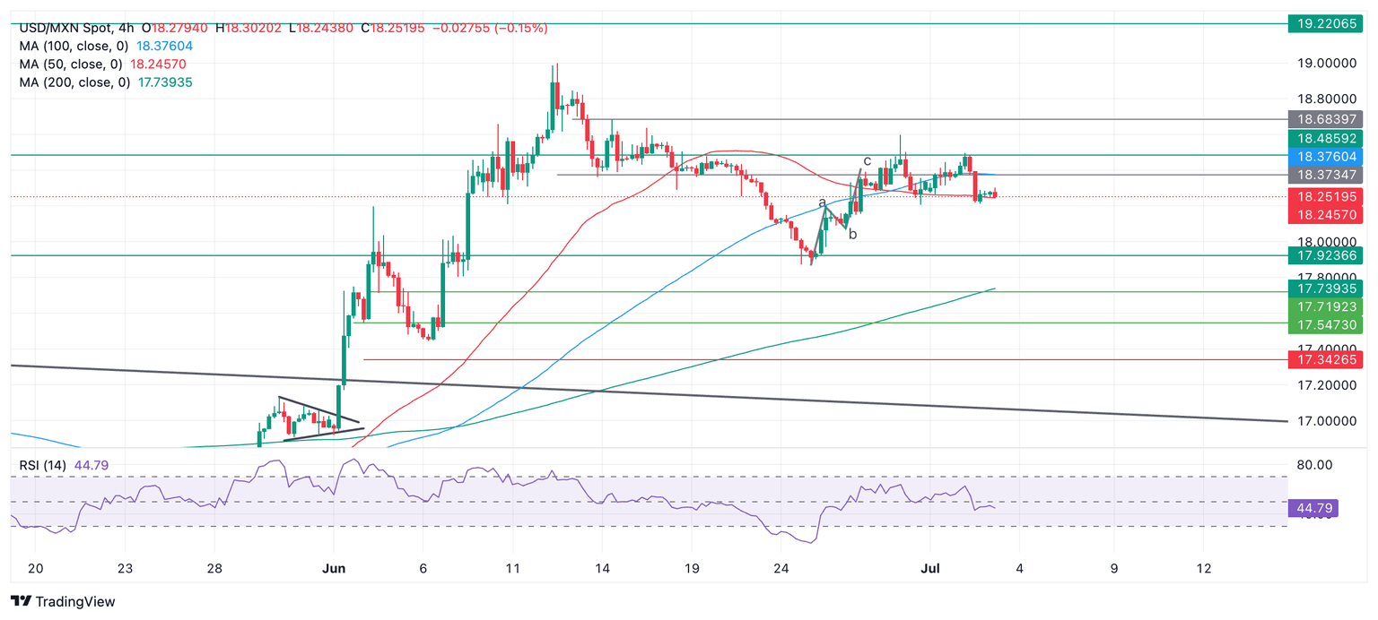 El USD/MXN serpentea en un rango después de retroceder desde su máximo del 28 de junio en 18,59. Actualmente se encuentra en el extremo inferior del rango, negociándose en los 18,20. Es posible que el par esté entrando en una tendencia lateral aunque aún es un poco temprano para estar seguros.