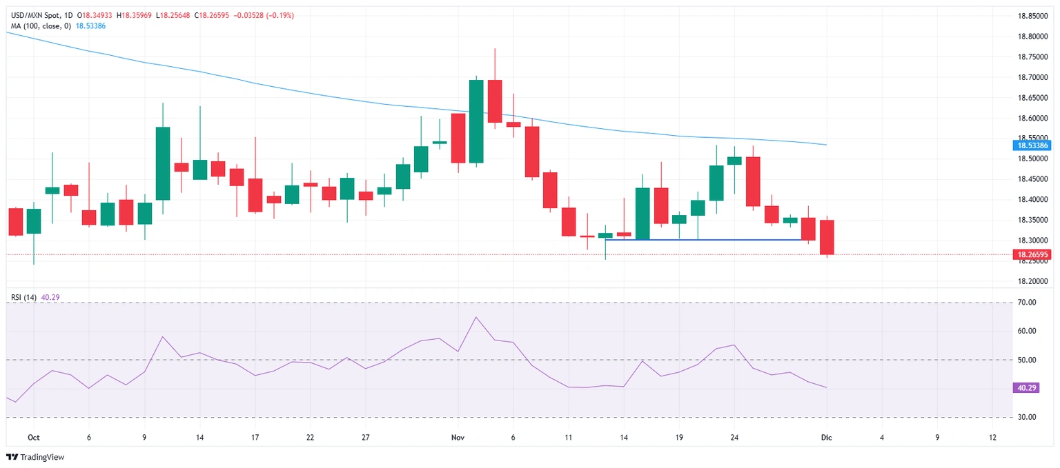 El USD/MXN ha abierto la semana alcanzando un máximo diario en 18.35, pero posteriormente se ha ido deslizando a la baja hasta caer a 18.25, nivel probado el pasado 13 de noviembre que marca su nivel más bajo en dos meses. Al momento de escribir, el Dólar opera frente al Peso mexicano sobre 18.26, perdiendo un 0.21% en el día.