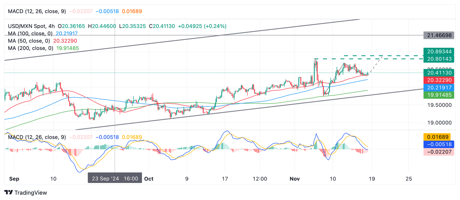 El USD/MXN ha retrocedido después de subir dentro de un canal ascendente. La tendencia a corto plazo probablemente sea alcista pero también podría ser lateral. El retroceso desde el máximo del 12 de noviembre ha encontrado soporte en la media móvil simple (SMA) de 50 periodos en el gráfico de 4 horas (como se ve a continuación), y el par podría estar a punto de comenzar a recuperarse.