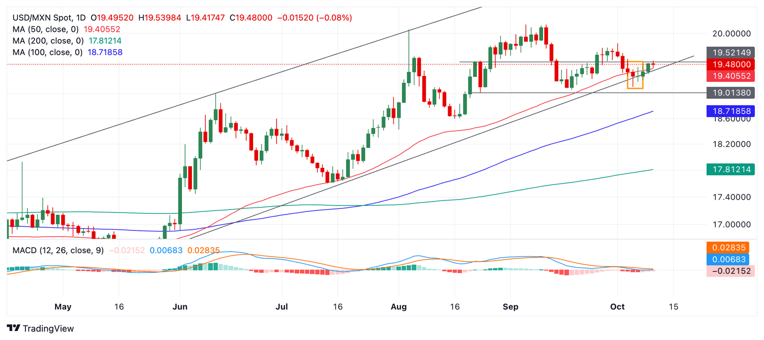 El Peso mexicano (MXN) sube frente al Dólar estadounidense (USD) el jueves después de la publicación de datos mixtos de EE.UU. Un dato de inflación superior al esperado fue eclipsado por débiles datos de solicitudes de subsidio por desempleo en EE.UU. para la primera semana de octubre.