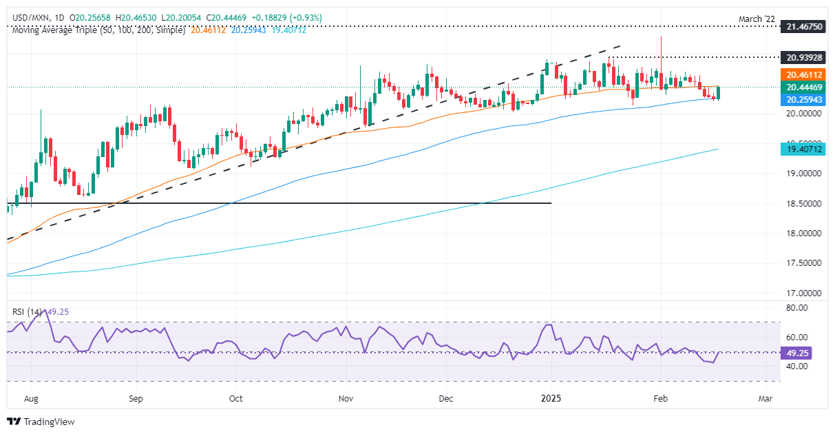 La tendencia alcista del USD/MXN se reanudó a medida que el par exótico probó la media móvil simple (SMA) de 100 días en 20.22, pero no logró superarla. El impulso favorece a los compradores a corto plazo debido a que el Índice de Fuerza Relativa (RSI) se encuentra en territorio bajista.