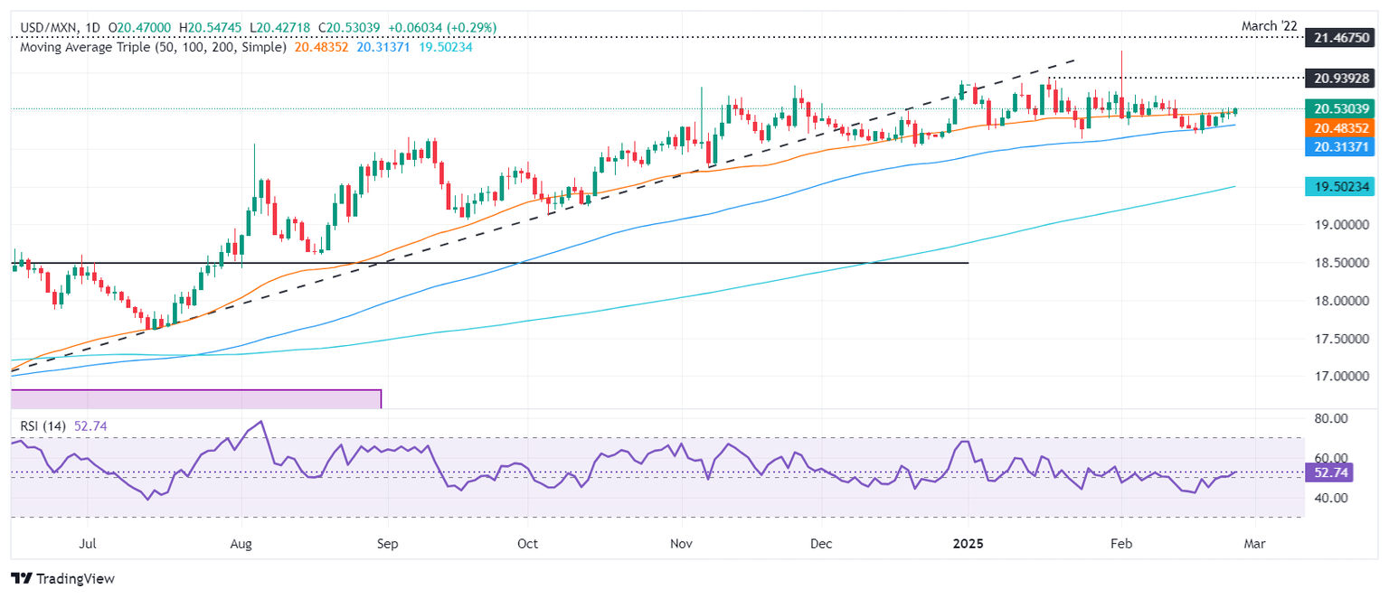 El USD/MXN sigue sesgado al alza, y una vez que supere la media móvil simple (SMA) de 50 días en 20.45, el camino hacia superar 20.50 está en juego. El Índice de Fuerza Relativa (RSI), por encima de 50, alcanzó su punto más alto en febrero, lo que indica que el impulso favorece a los compradores. Deben superar el máximo del 17 de enero de 20.93, seguido de 21.00 y el máximo del año hasta la fecha (YTD) de 21.28.