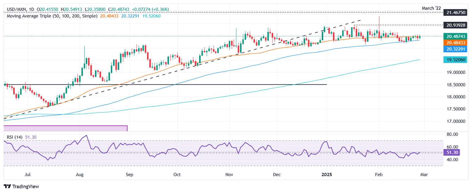 La tendencia alcista del USD/MXN se mantiene, aunque los compradores no logran romper decisivamente la media móvil simple (SMA) de 50 días en 20.45, lo que abriría la puerta para probar 20.50. El momentum sigue siendo alcista, como lo muestra el Índice de Fuerza Relativa (RSI), que continúa apuntando hacia arriba, respaldado por los comentarios de Trump. Sin embargo, su retórica podría desencadenar un cambio y favorecer al Peso, que, como se mencionó, sigue siendo fuertemente influenciado por Trump.