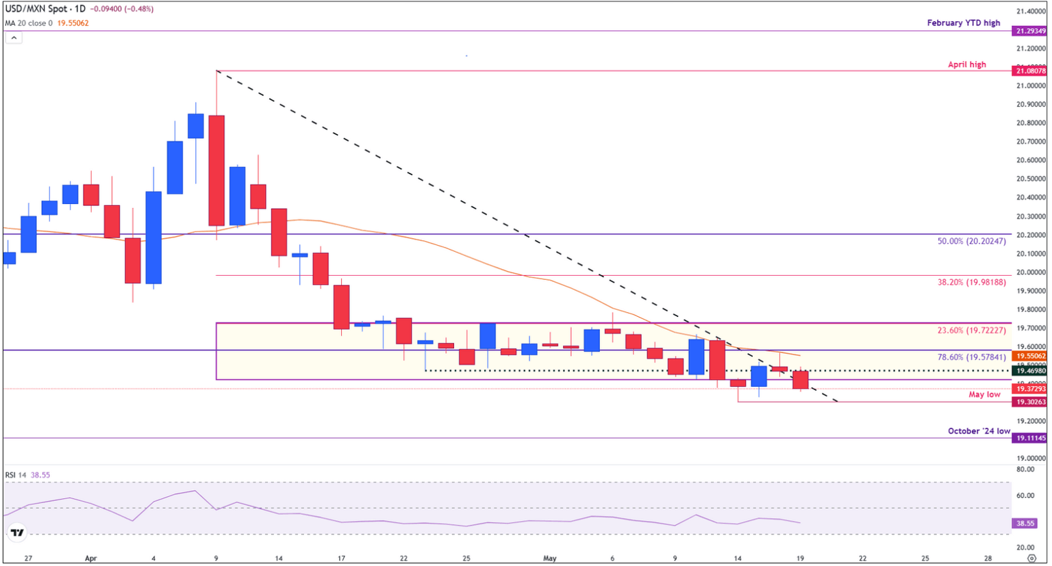 El USD/MXN ha roto por debajo de su zona de consolidación de múltiples sesiones, deslizándose por debajo de la banda de soporte clave entre 19.40 y 19.46, que había contenido previamente la acción del precio desde mediados de abril.