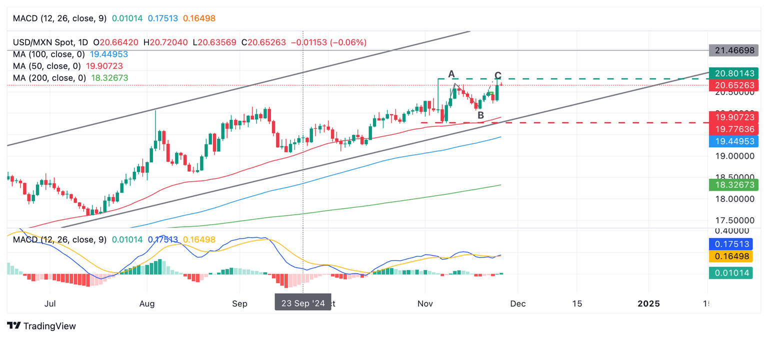 El USD/MXN se mantiene en niveles elevados por encima de 20.50 el miércoles, cotizando cerca de la parte superior del mini rango (línea discontinua verde en el gráfico a continuación) formado durante noviembre.