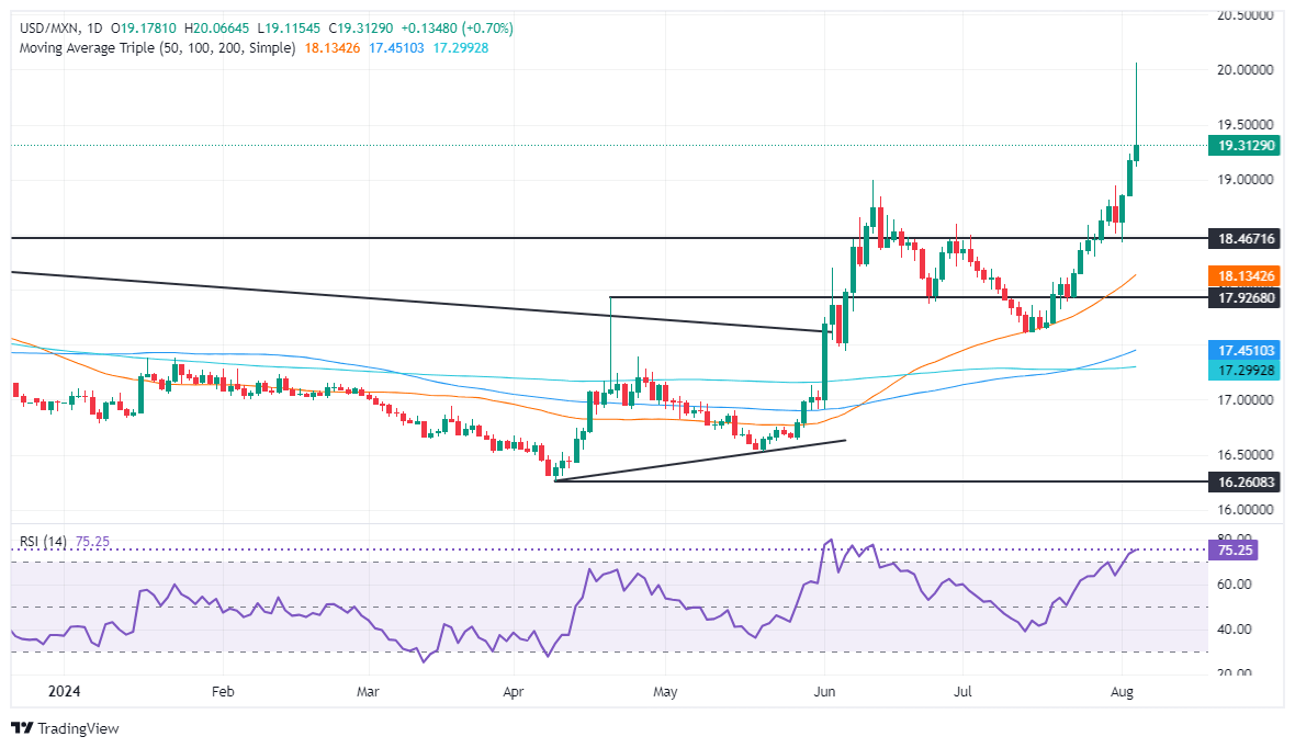 Análisis técnico: El Peso mexicano se deprecia bruscamente mientras el USD/MXN sube por encima de 19.30