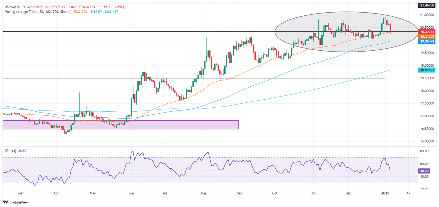 - El Peso mexicano se aprecia, empujando al USD/MXN a la baja más del 1.5% hasta 20.28 tras especulaciones sobre aranceles en The Washington Post.