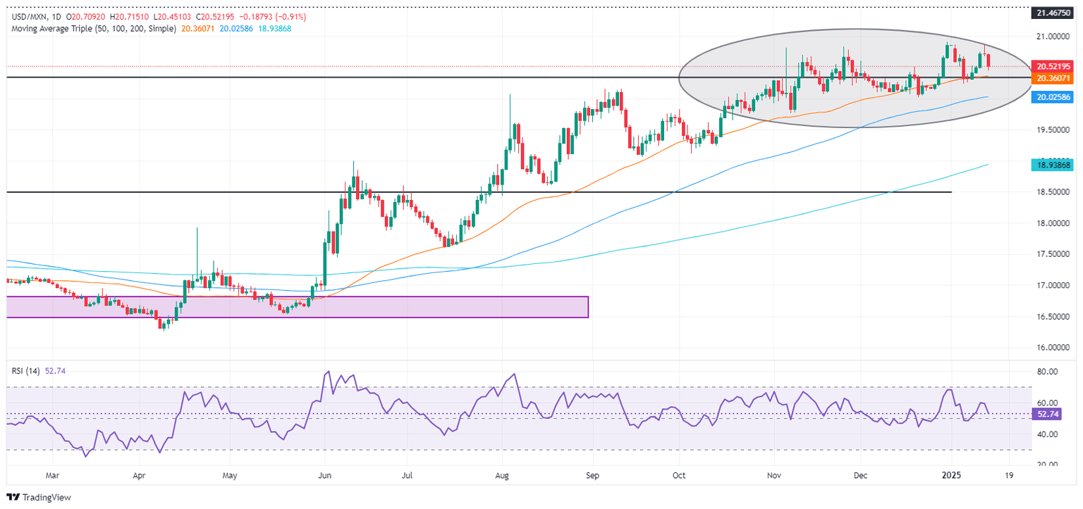 La tendencia alcista del USD/MXN se mantiene mientras los compradores mantengan los precios por encima de la media móvil simple (SMA) de 50 días de 20.32, pero a corto plazo el impulso ha cambiado ligeramente a bajista.