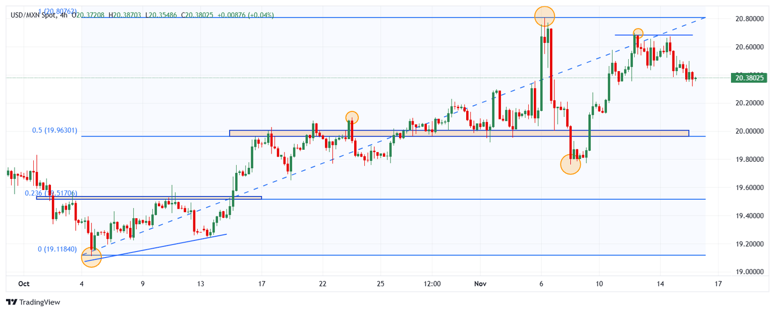 El USD/MXN estableció un máximo del día en 20.56, donde atrajo vendedores agresivos que llevaron la paridad a un mínimo no visto desde el 11 de noviembre en 20.31. Actualmente, el precio del dólar estadounidense opera sobre el Peso mexicano en 20.38, perdiendo un 0.35%, al concluir la jornada del viernes.