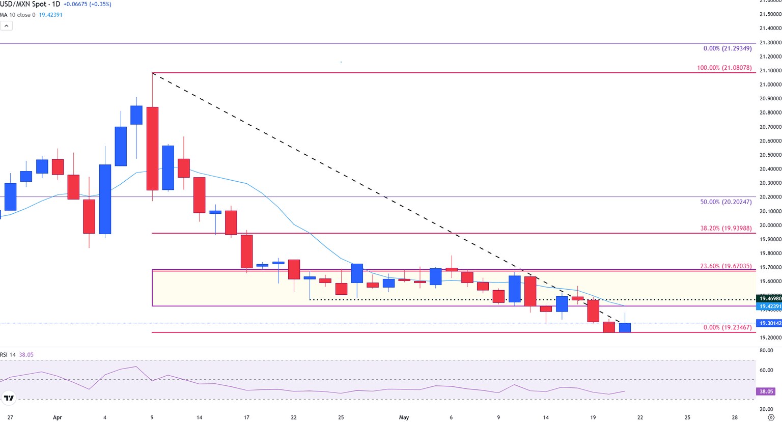 Actualmente, los precios han subido por encima de la línea de tendencia descendente anterior establecida desde la caída de abril, proporcionando una barrera inminente de soporte en 19.28.