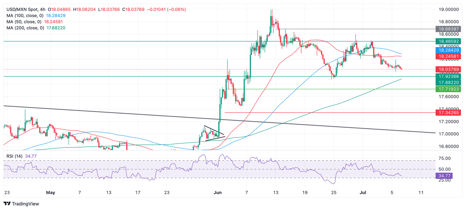 El USD/MXN se desliza hacia el mínimo clave del 24 de junio en 17,87.