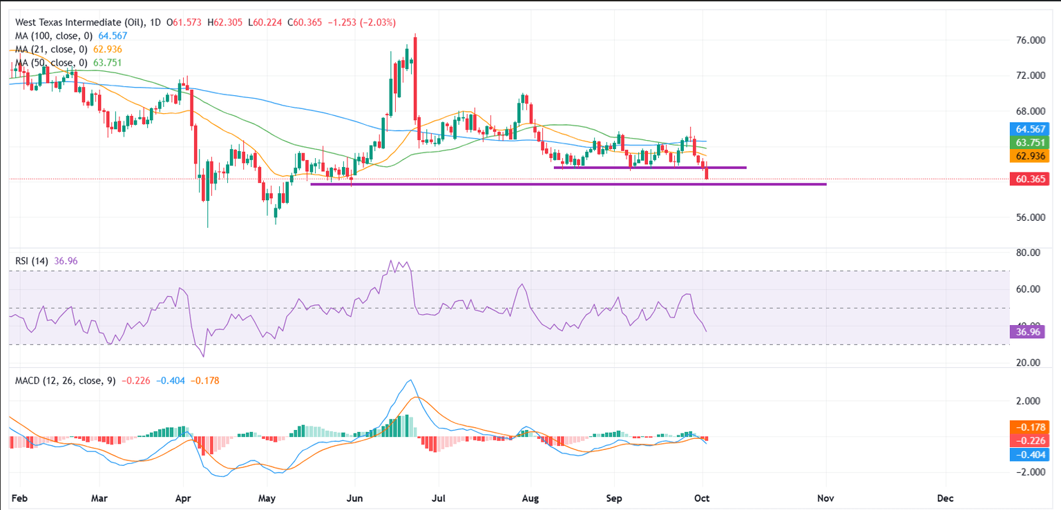 - La perspectiva técnica sigue siendo bajista, con el WTI deslizándose por debajo del soporte clave y los indicadores de momentum señalando más caídas.