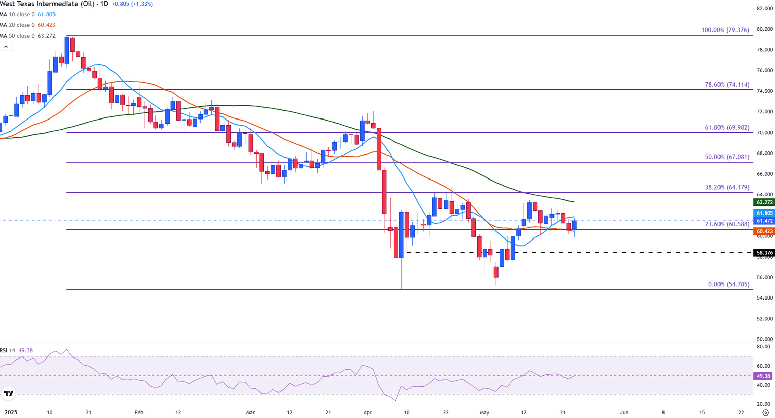 Después de experimentar dos días consecutivos de pérdidas, el fracaso en caer por debajo del nivel de retroceso de Fibonacci del 23.6% de la caída acumulada de enero a abril en 60.588 ha proporcionado un alivio temporal para los operadores alcistas del petróleo WTI.