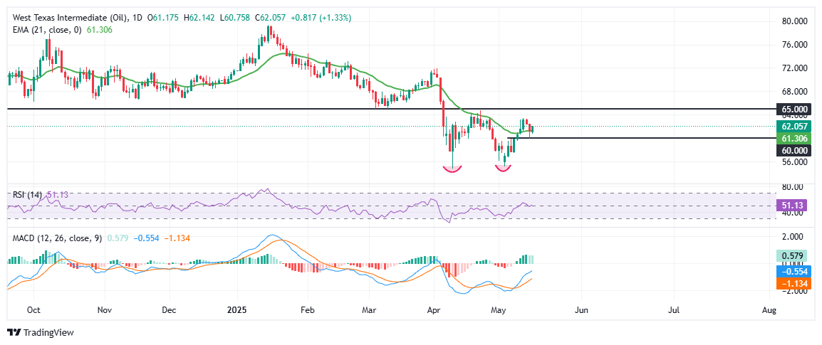 Técnicamente, el WTI ha logrado mantenerse a flote por encima del nivel psicológico de 60$, mientras defiende la base de doble suelo de 55$—una zona que marca los niveles más bajos desde 2021. El gráfico diario muestra el precio recuperando la media móvil exponencial (EMA) de 21 días en 61.29$, una señal alcista a corto plazo. El Índice de Fuerza Relativa (RSI) ha subido a 50,70, mientras que el histograma del indicador de convergencia/divergencia de medias móviles (MACD) se ha vuelto positivo, indicando una leve recuperación en el impulso alcista.
