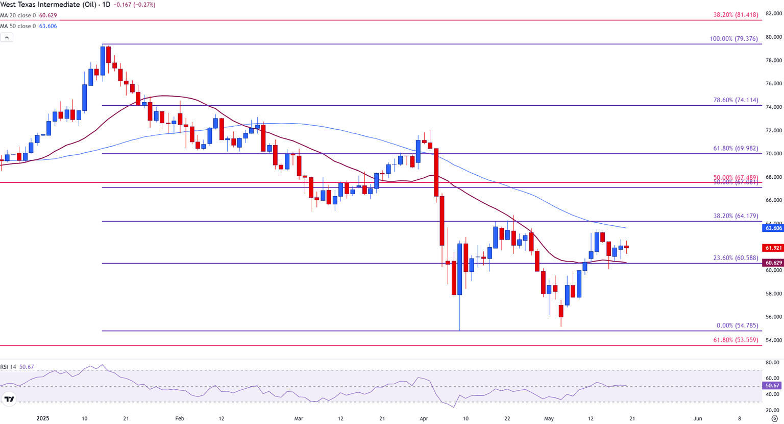 - El WTI se mantiene en un rango con precios que cotizan entre las SMA de 20 y 50 días.