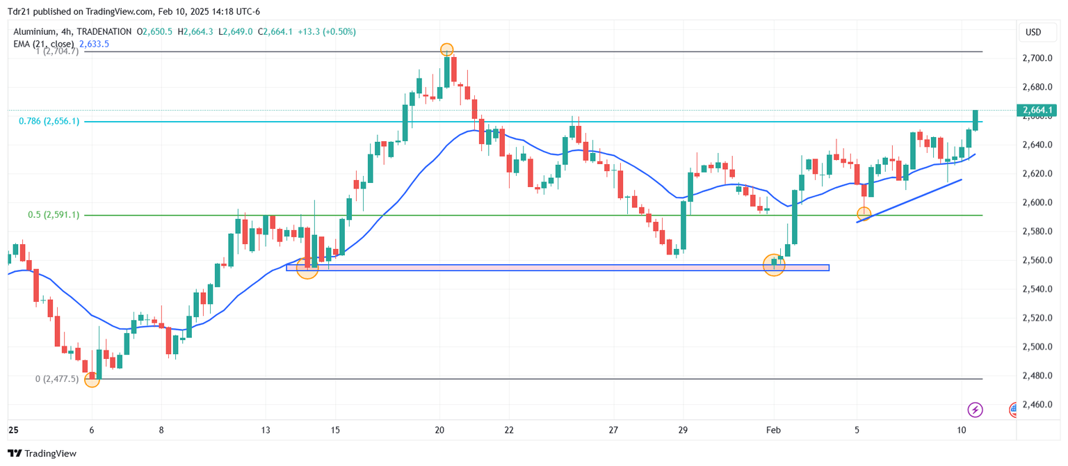 El aluminio registró un mínimo del día en 2.614$, donde atrajo compradores agresivos que llevaron su precio a máximos de casi tres semanas no vistos desde el 21 de enero en 2.664. Actualmente, el aluminio opera sobre 2.664$ por tonelada, ganando un 1.27% diario.