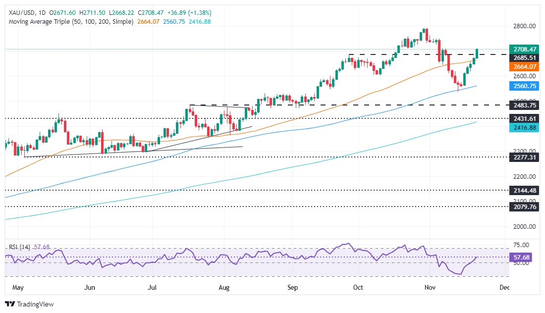 Por otro lado, si el XAU/USD cae por debajo de 2.700$, el metal sin rendimiento podría comenzar a cotizar dentro del rango de 2.650$-2.700$ a menos que los bajistas rompan el mínimo del 14 de noviembre de 2.536$, seguido de 2.500$.