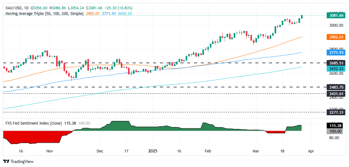 Debido a la agresividad de la tendencia alcista, el Índice de Fuerza Relativa (RSI) se volvió sobrecomprado, superando 70. Sin embargo, la lectura más extrema sería 80 al momento de escribir. Por el contrario, si el XAU/USD cae por debajo del máximo de marzo de 3.057$, esto podría agravar un retroceso hacia 3.000$.