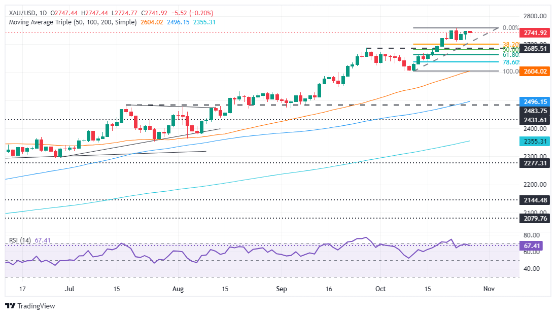 El XAU/USD cotiza a 2.742$ después de alcanzar un máximo diario de 2.747$. El rendimiento del bono del Tesoro estadounidense a 10 años continuó subiendo, aumentando tres puntos básicos hasta el 4.272%. Esto ha impedido que los precios del Bullion registren un nuevo máximo histórico por encima de 2.758$, ya que algunos analistas apuntan a la marca de 2.800$ hacia el final del año.