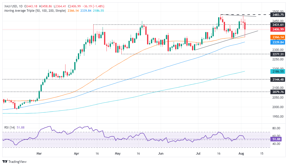 El precio del Oro cayó más del 1% durante la sesión norteamericana del lunes, pero se recuperó después de alcanzar un nuevo mínimo de seis días de 2.364$ en medio de una venta masiva en los mercados mundiales provocada por los datos más débiles de lo esperado en Estados Unidos (EE.UU.) la semana pasada. El XAU/USD cotiza en 2.407$, con una caída del 1,40%.