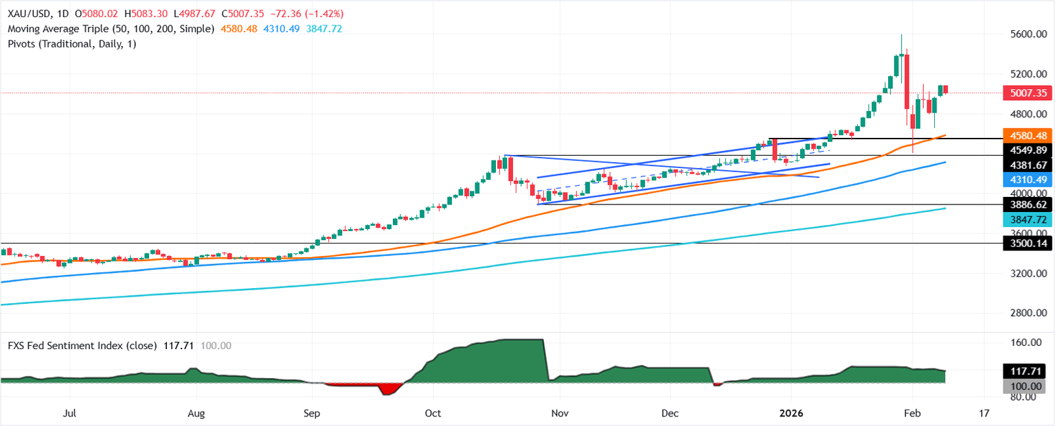 Si el Oro supera los 5,100$, esto abrirá la puerta a precios más altos, como 5,200$, seguido del pico del 30 de enero en 5,451$ y el máximo histórico cerca de 5,600$. A la baja, un movimiento por debajo de 5,000$ abrirá la puerta para probar la media móvil simple (SMA) de 20 días en 4,910$, seguido de 4,800$ y antes del mínimo del 2 de febrero en 4,402$.
