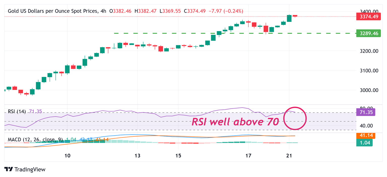 Mientras tanto, los anuncios de tarifas de Trump, que van y vienen, han afectado la confianza en la economía más grande del mundo. Esto, junto con las perspectivas de un alivio de políticas más agresivo, arrastra al Dólar estadounidense (USD) a su nivel más bajo desde abril de 2022 y respalda aún más el precio del Oro. Sin embargo, los alcistas del XAU/USD podrían hacer una pausa para tomar aliento en medio de condiciones sobreextendidas en los gráficos a corto plazo.