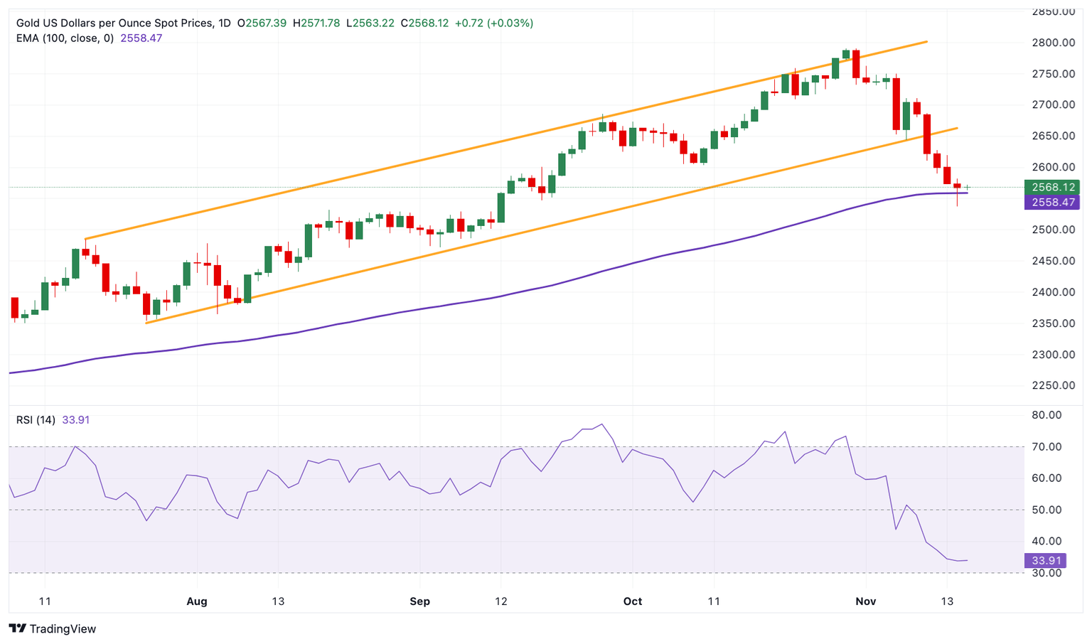 Al alza, el nivel de resistencia inmediata para el XAU/USD surge cerca del nivel de soporte convertido en resistencia en 2.665$. Una ruptura decisiva por encima de este nivel podría resultar en un repunte hasta 2.750$, el máximo del 6 de noviembre.