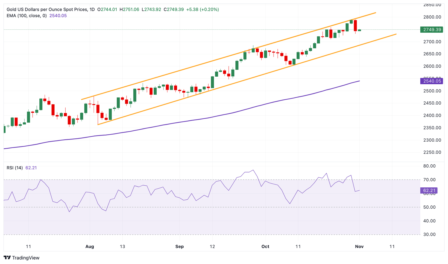 - "El Oro debería mantener su sesgo alcista e incluso podría coquetear con los 2.800 $ en los próximos días, siempre que los riesgos electorales en EE.UU. sigan pesando en el sentimiento del mercado, mientras las expectativas de recorte de tasas de la Fed permanezcan intactas," dijo Han Tan, analista jefe de mercado en Exinity Group.