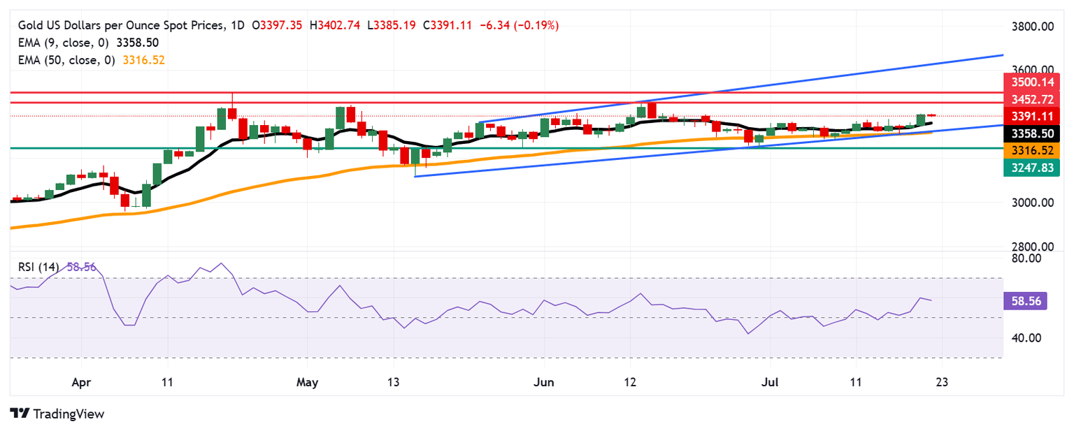 El precio del oro (XAU/USD) está cotizando alrededor de 3.390$ por onza troy el martes. Un análisis técnico del gráfico diario sugiere que el precio del metal se consolida dentro de un patrón de canal ascendente, sugiriendo un sesgo alcista prevaleciente. Además, el Índice de Fuerza Relativa (RSI) de 14 días se mantiene por encima de 50, reforzando una perspectiva alcista.