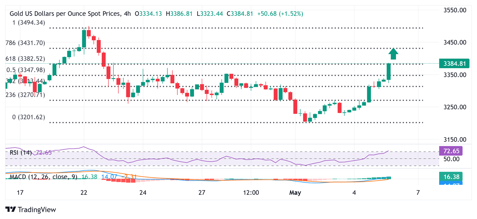 Desde una perspectiva técnica, el fuerte movimiento intradía al alza eleva el precio del Oro más allá del obstáculo de 3.350$, que coincidió con el nivel de retroceso de Fibonacci del 50% de la reciente caída desde el máximo histórico. Esto, junto con osciladores positivos en el gráfico diario, sugiere que el camino de menor resistencia para la mercancía sigue siendo al alza. Algunas compras adicionales más allá del nivel de 61.8% de Fibonacci, alrededor de la región de 3.385$, reafirmarán el sesgo positivo y elevarán el XAU/USD más allá de la marca de 3.400$, hacia la siguiente barrera relevante cerca de la zona de 3.425$. El posterior movimiento al alza debería permitir a los alcistas hacer un nuevo intento de conquistar la marca psicológica de 3.500$.