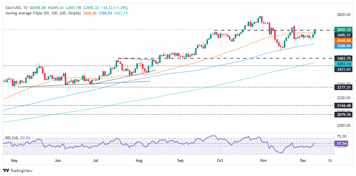 El Oro subió durante la sesión norteamericana del martes con los compradores apuntando a la zona de 2.700$ por primera vez desde el 25 de noviembre. Uno de los impulsores del aumento en el precio del metal amarillo es la expectativa de que la Reserva Federal (Fed) recorte las tasas en la reunión de diciembre. Al momento de escribir, el XAU/USD cotiza sobre 2.694$, subiendo un 1.32%.