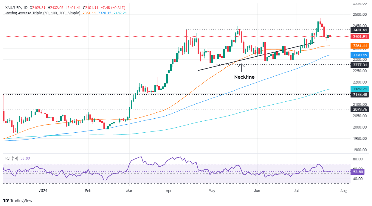 Después de formar un 'bullish haram', los precios del oro alcanzaron un máximo de tres días por encima de 2.430$, pero han retrocedido por debajo del máximo del 23 de julio de 2.412$, lo que sugiere una falta de fuerza de los compradores. Un cierre diario por debajo de este último podría exponer al XAU/USD a una mayor presión de venta, aunque los datos de EE.UU. impulsarán la acción del precio el jueves y viernes.