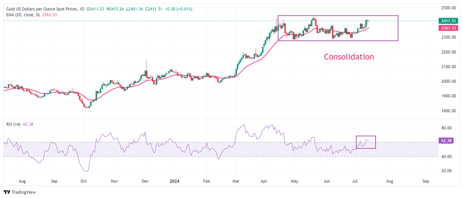 El precio del Oro cotiza en un rango ajustado, ligeramente por encima de 2.400$. El metal precioso busca más pistas sobre cuándo la Fed comenzará a reducir las tasas de interés. El metal amarillo exhibe un movimiento de consolidación durante los últimos tres meses, oscilando entre 2.277$ y 2.450$.