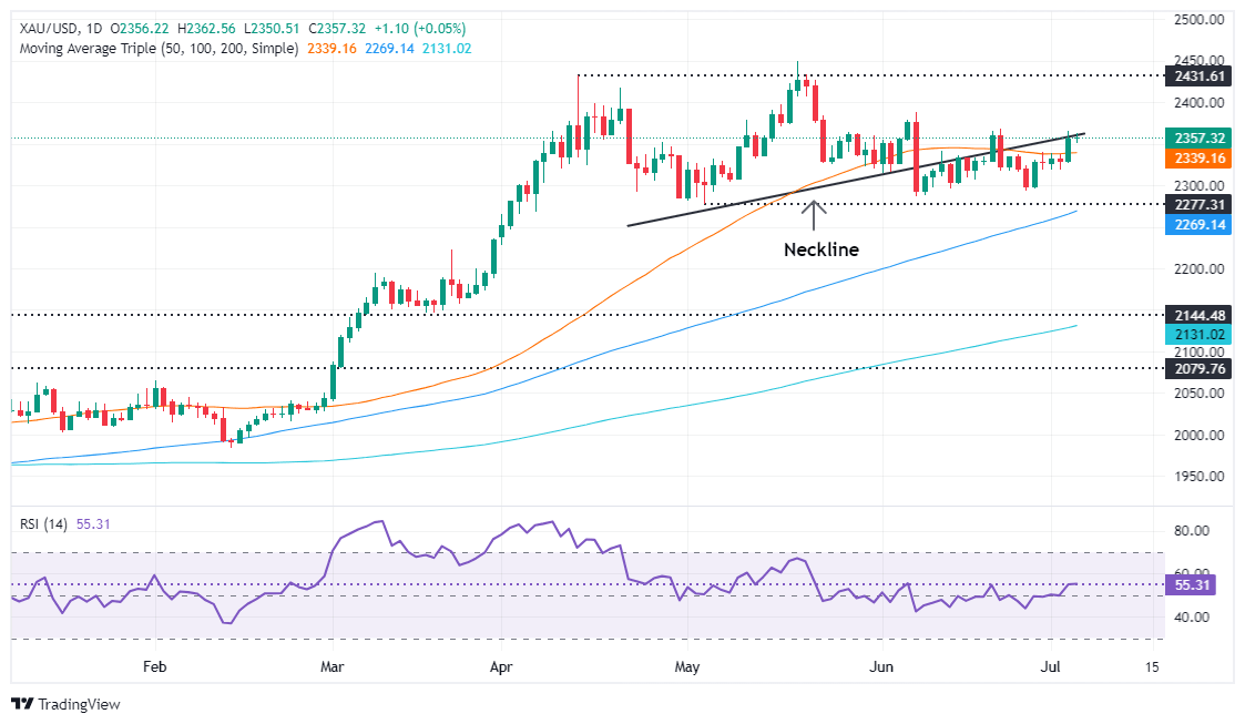 Si el precio del oro rompe por encima de la línea de cuello del patrón, podría subir a 2.400$, invalidando la formación del gráfico de hombro-cabeza-hombro y potencialmente llevando a más ganancias hacia el máximo del año hasta la fecha de 2.450$.