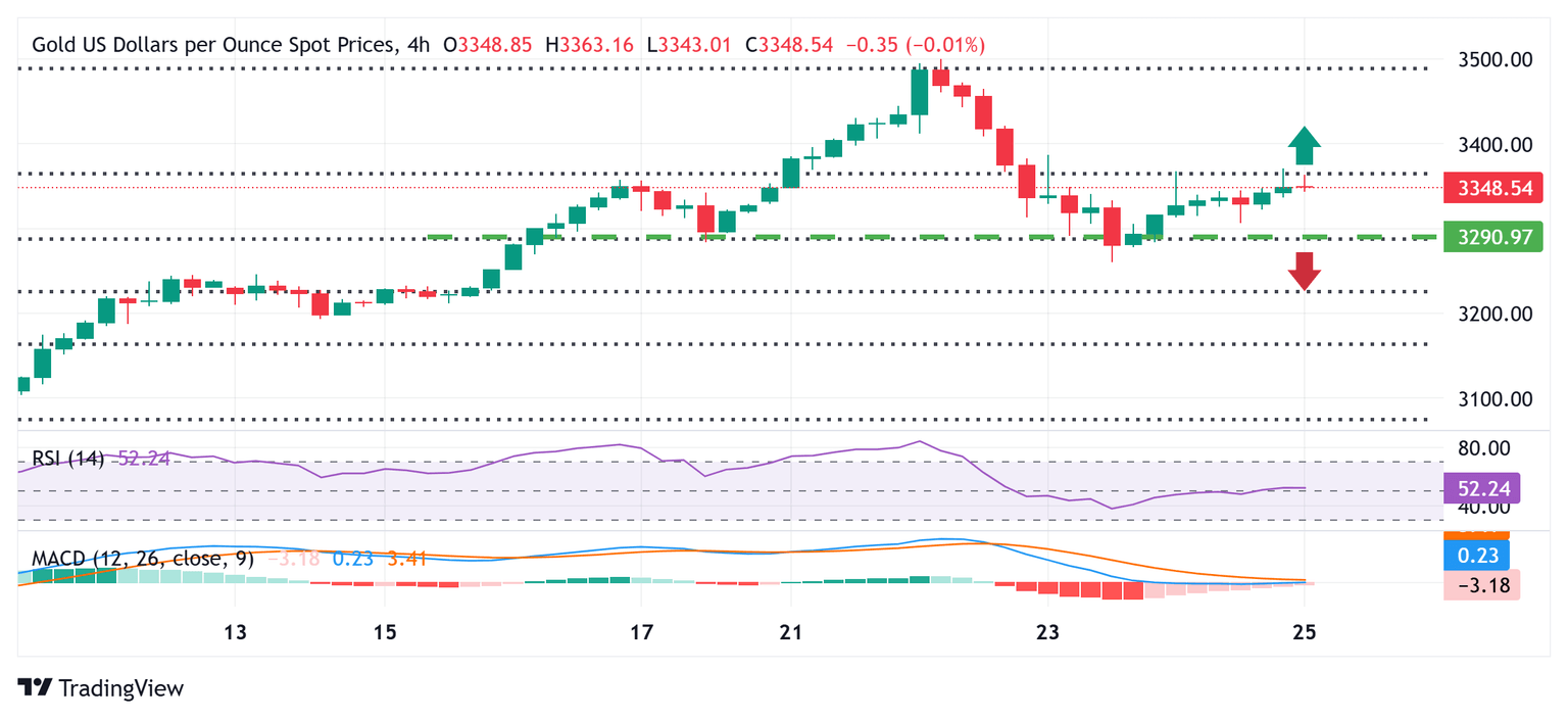 - La geopolítica, las incertidumbres relacionadas con el comercio y las apuestas de recortes de tasas de la Fed limitan las pérdidas para el par XAU/USD.