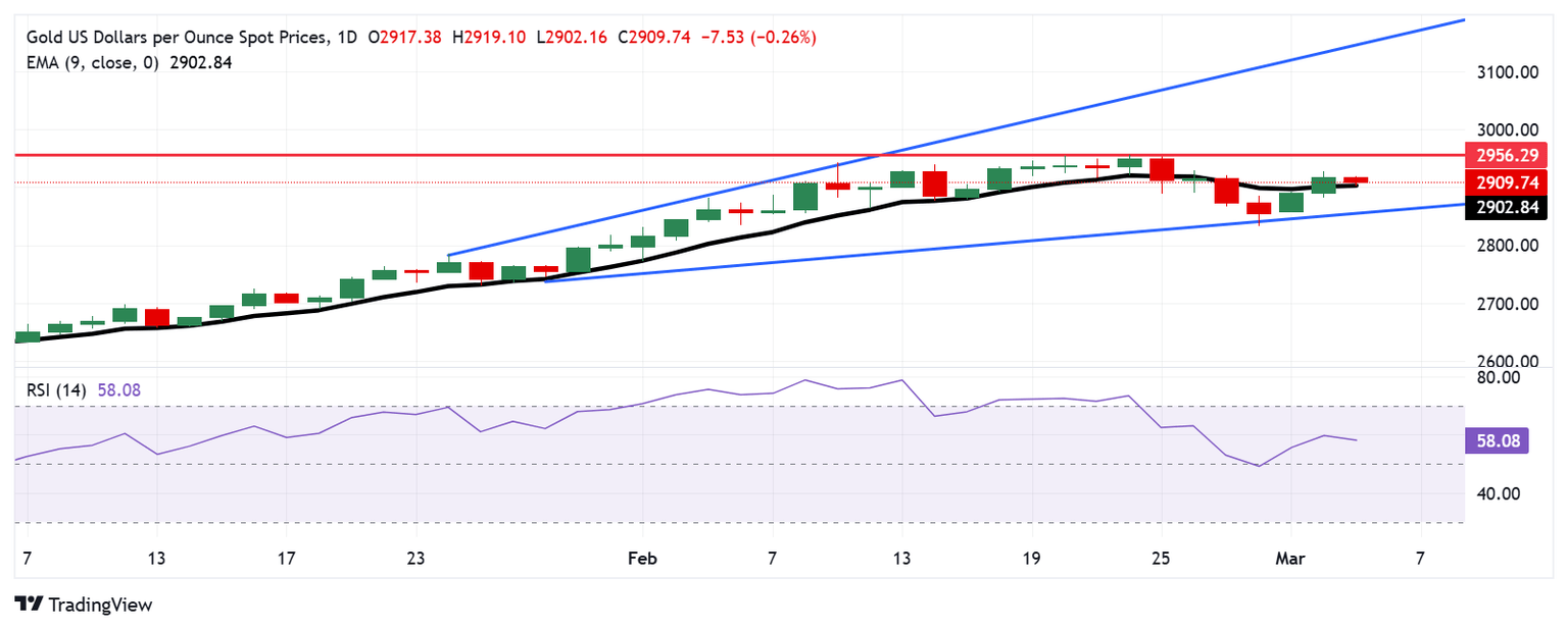 El precio del Oro (XAU/USD) se cotiza alrededor de 2.910$ por onza troy el miércoles. El análisis técnico del gráfico diario sugiere que el precio del metal se consolida dentro de un patrón de canal ascendente, lo que sugiere que el sesgo alcista se mantiene intacto. Además, el Índice de Fuerza Relativa (RSI) de 14 días se mantiene por encima de 50, reforzando una perspectiva bajista.