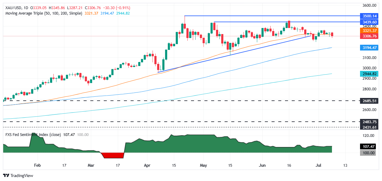 Desde una perspectiva de acción del precio, el XAU/USD necesita superar el mínimo del 30 de junio de 3.246$ para abrir el camino a una mayor caída, con la media móvil simple (SMA) de 100 días en 3.181$ en la mira, seguida por el mínimo del 15 de mayo de 3.120$.