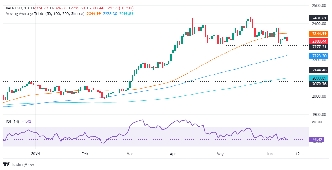 El precio del Oro permanece neutral a sesgado a la baja ya que el patrón de gráfico de Cabeza y Hombros permanece en su lugar, lo que sugiere que el precio del metal sin rendimiento está preparado para más pérdidas. El Momentum medido por el RSI muestra que los vendedores están a cargo, una indicación de que una vez que el precio del XAU/USD caiga por debajo de los 2.300$, se avecinan precios más bajos.