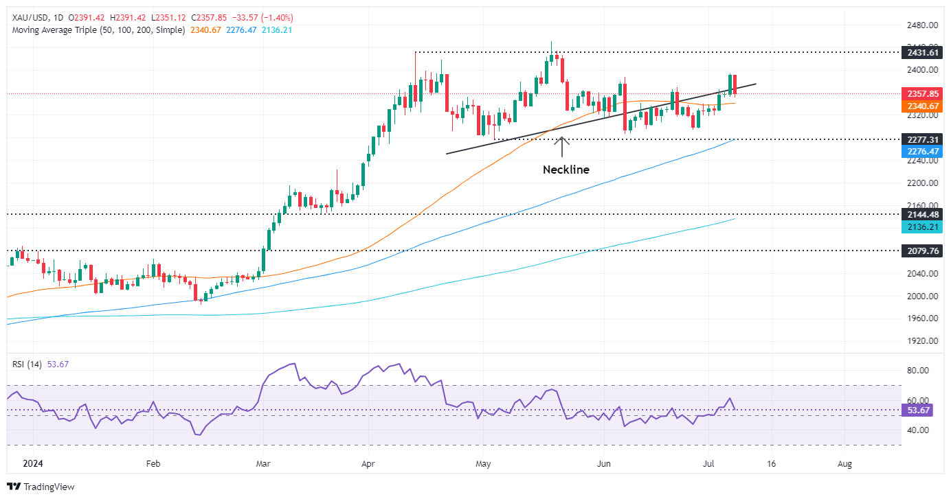 El precio del Oro ha retrocedido después de romper decisivamente el cuello del patrón de Hombro-Cabeza-Hombro, lo que llevó al precio del XAU/USD a 2.392$ antes de caer hacia 2.357$, el tipo de cambio actual, abriendo la puerta a una consolidación.