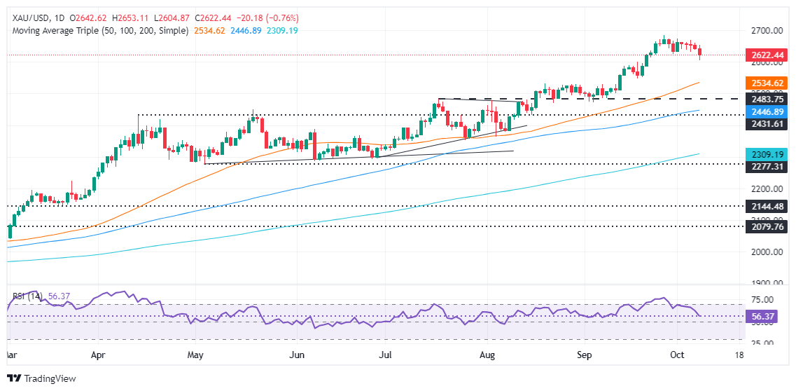 Una vez que el XAU/USD cayó por debajo del mínimo del 30 de septiembre de 2.624$, patrocinó una pierna hacia la marca de 2.600$. En caso de mayor debilidad, el siguiente suelo será la Media Móvil Simple (SMA) de 50 días en 2.534$.