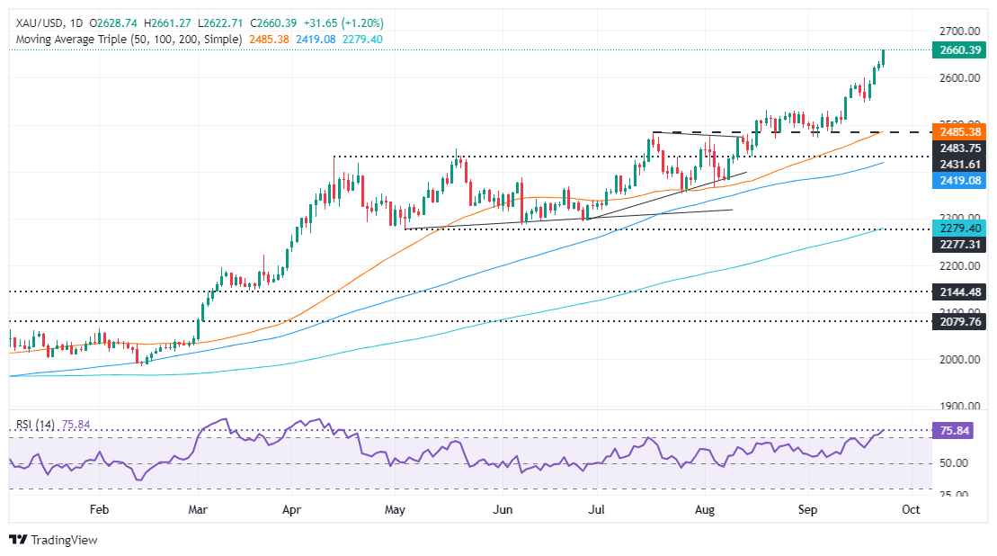El XAU/USD tiene un sesgo alcista, listo para imprimir continuos máximos históricos, aunque el repunte parece sobreextendido, con los operadores mirando la cifra de 2.700$. El momentum favorece a los compradores, aunque el Índice de Fuerza Relativa (RSI) se ha vuelto sobrecomprado. Por lo tanto, los compradores deben estar atentos a que un retroceso podría estar en las cartas.