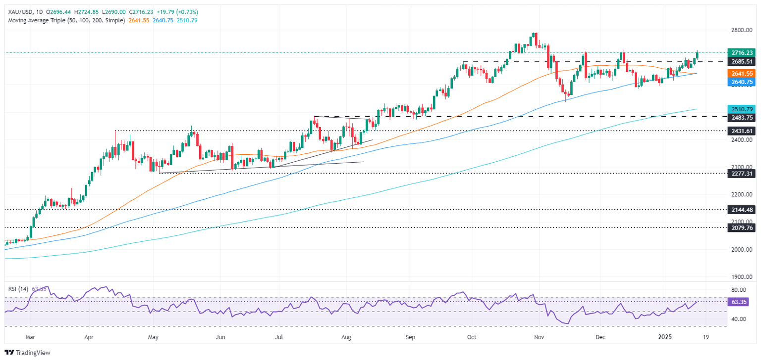 La primera resistencia del XAU/USD será el máximo del 12 de diciembre de 2.726$. Una vez superado, la siguiente parada sería 2.750$, seguido del máximo histórico (ATH) en 2.790$.