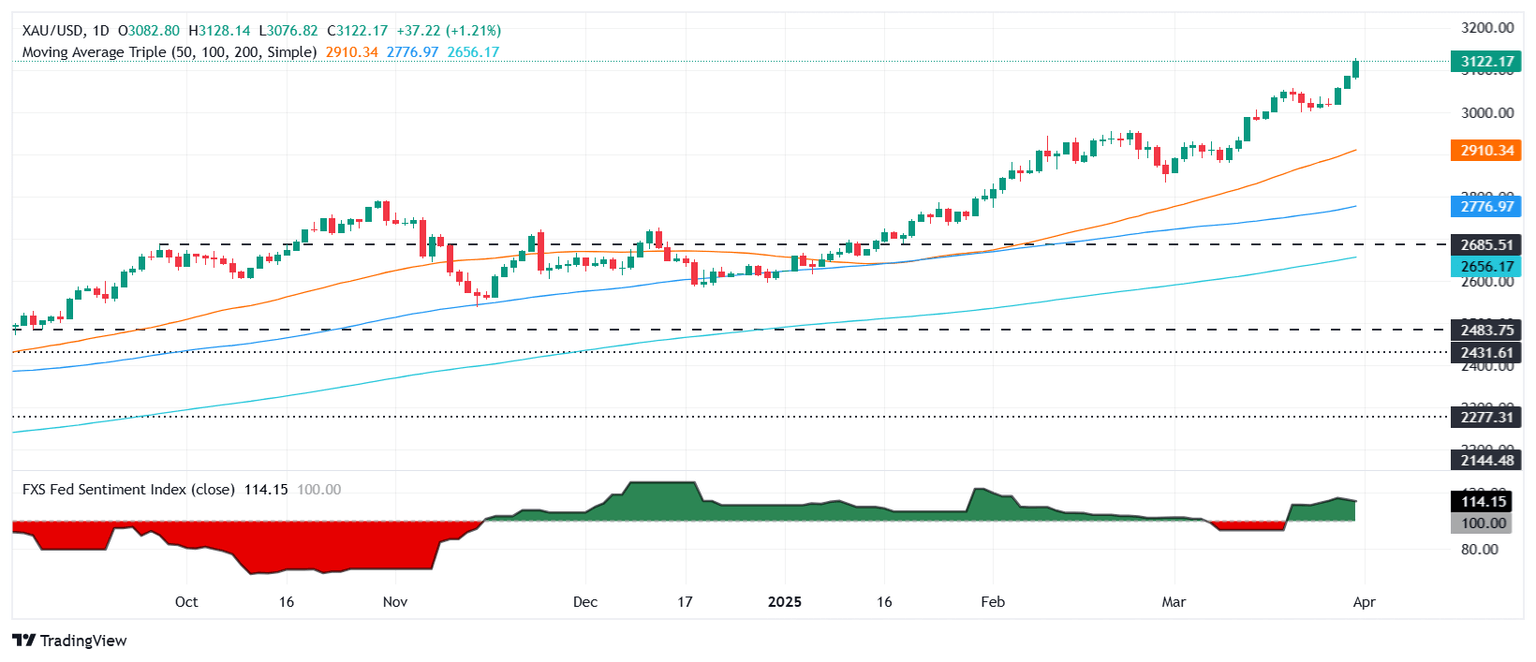 El Oro imprime otro récord el lunes, superando el umbral de 3.100$ por primera vez y extendiendo sus ganancias a un máximo histórico de 3.127$ antes de retroceder un poco. La incertidumbre en torno a las políticas comerciales de EE.UU. y el Día de la Liberación del 2 de abril persiste, con los inversores cambiando a una postura aversa al riesgo y acudiendo al atractivo de refugio seguro del metal amarillo. Al momento de escribir, el XAU/USD cotiza a 3.119$, subiendo más de un 1%.