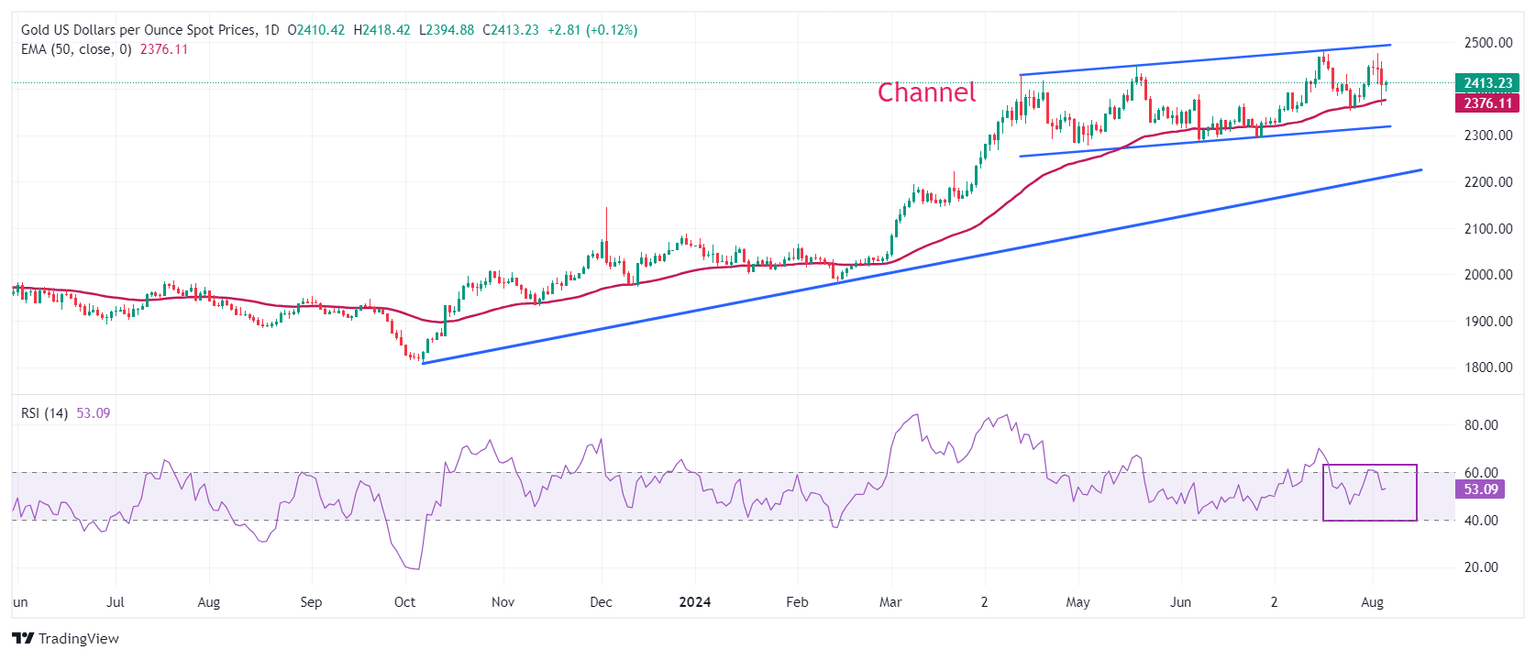 El precio del Oro se negocia en una formación de canal en un marco de tiempo diario, que está ligeramente en alza pero en general ha mostrado un rendimiento lateral durante más de tres meses. La media móvil exponencial (EMA) de 50 días cerca de 2.370$ sigue proporcionando soporte a los alcistas del Oro.