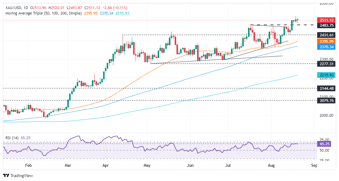 El gráfico diario del Oro sugiere que el metal amarillo se espera que suba más si los compradores superan el máximo histórico en 2.531$. El impulso sugiere que los alcistas están a cargo, como lo muestra el Índice de Fuerza Relativa (RSI).