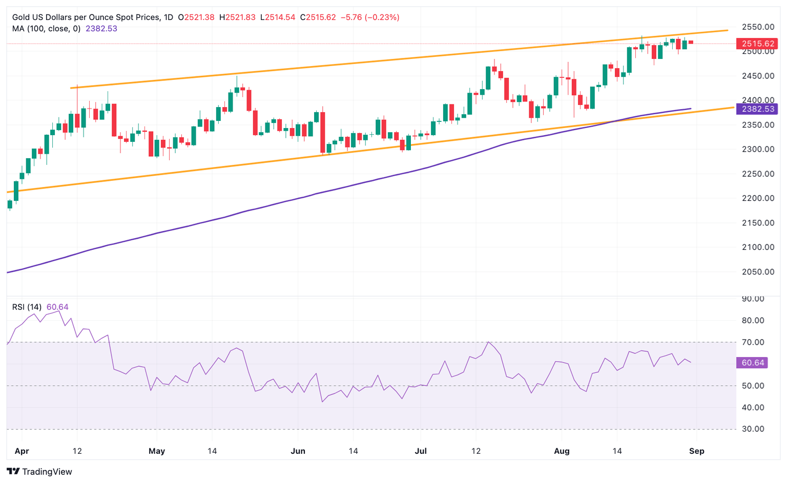 Los inversores seguirán de cerca los datos de inflación de EE.UU. para obtener más información sobre el tamaño potencial del recorte de tasas de la Fed. Se estima que el índice de precios del gasto en consumo personal (PCE) subyacente, la medida preferida de la Fed para la inflación, muestre un aumento del 2,7% interanual en julio, en comparación con el 2,6% de junio. Una lectura del PCE más suave de lo esperado podría desencadenar que la Fed inicie un ciclo de recorte de tasas, lo que actúa como un viento de cola para el XAU/USD.