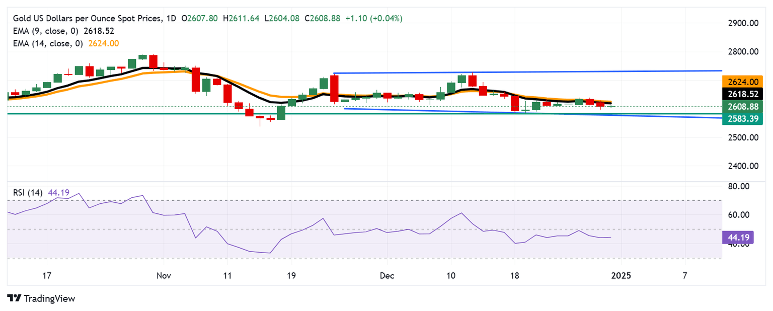 El precio del Oro cotiza cerca de 2.610,00$ por onza troy el martes, con el gráfico diario indicando una fase de consolidación mientras el metal se mueve lateralmente cerca de las Medias Móviles Exponenciales (EMAs) de nueve y 14 días. El Índice de Fuerza Relativa (RSI) de 14 días se sitúa justo por debajo de la marca de 50, reflejando un sentimiento neutral.