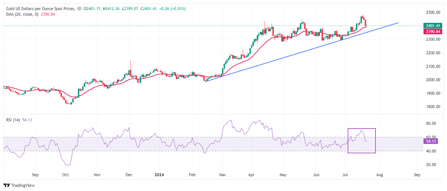 El precio del Oro cae por debajo del soporte de nivel redondo de 2.400$ el lunes. El metal precioso cae cerca de la media móvil exponencial (EMA) de 20 días, que cotiza alrededor de 2.390$, lo que sugiere que las perspectivas a corto plazo aún no se han debilitado técnicamente.