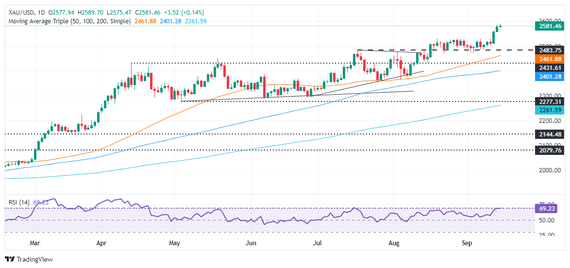 Si el XAU/USD supera el máximo histórico (ATH) de 2.589$, la próxima parada sería 2.600$. Si se supera, se podría esperar un mayor alza con los niveles psicológicos de 2.650$ y 2.700$ a continuación.