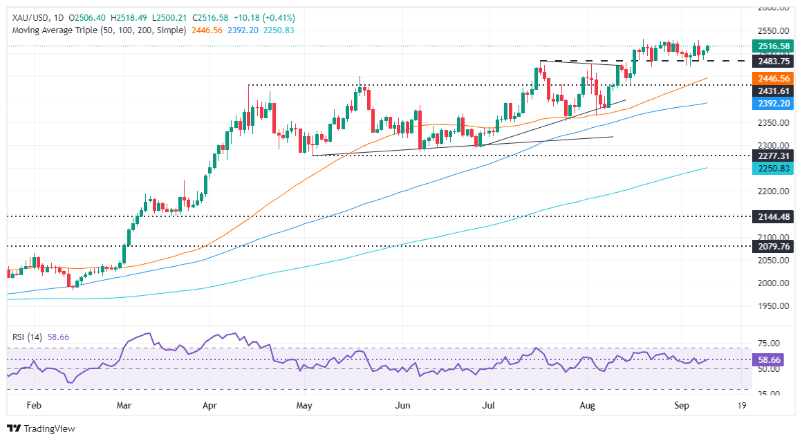 Desde un punto de vista técnico, el XAU/USD sube de manera constante pero no puede romper por encima del máximo histórico de 2.531$ mientras los operadores se preparan para una publicación de datos crítica el miércoles. El impulso muestra que el oro debería seguir cotizando lateralmente, basado en el Índice de Fuerza Relativa (RSI), que está casi plano.